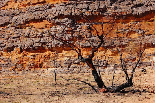 One of the most obvious features of the sandstones is the alternating orange and black or grey banding. The darker bands consist of permeable layers of rock, which allow water to move through with ease. Water keeps the rock surface moist allowing dark algae to grow on them. The less permeable layers in between are covered with a patina of iron and manganese staining, creating the orange bands. These outer coatings help to protect the lower parts of the towers from erosion.